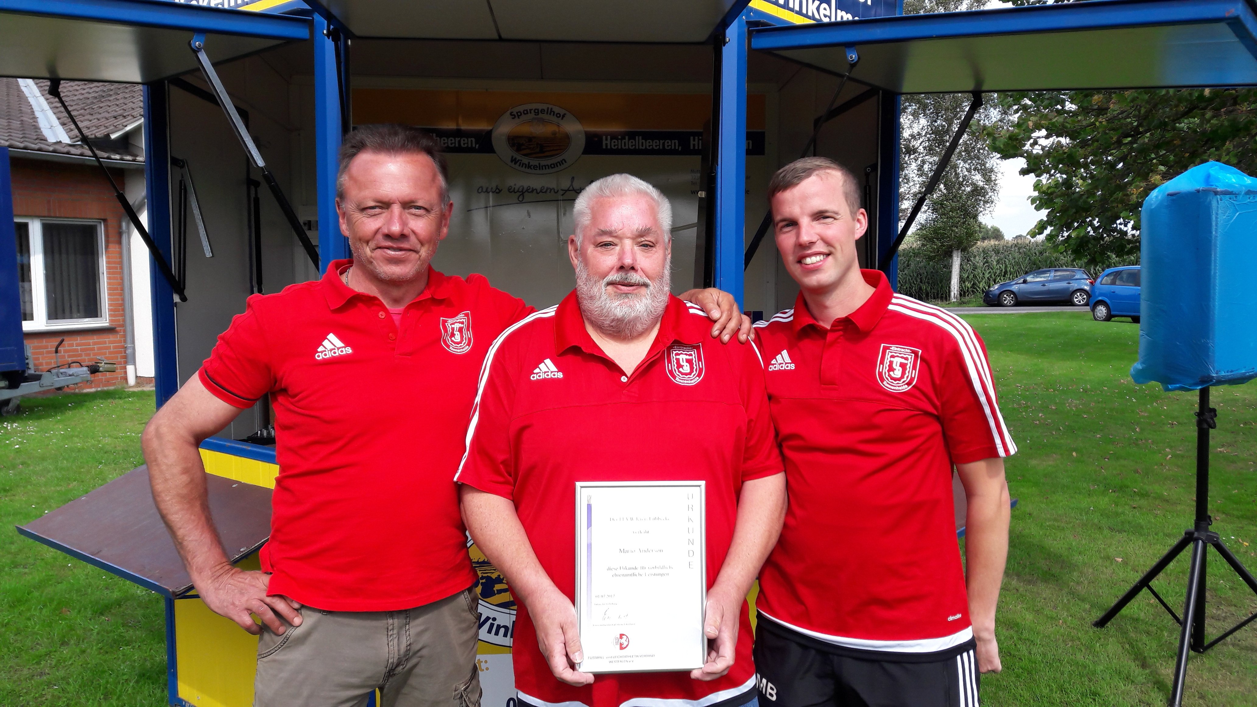 In der Bildmitte Mario mit Urkunde, links Volker Witting und rechts Martin Bohnhorst.