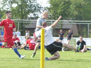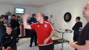 Das parallel laufende Dartsturnier, das zum dritten Mal ausgetragen wurde, lockte unter der Regie von Dennis Bergsieker und Maik Ahrens insgesamt 18 Teilnehmer an die beiden „boards“. Rekordbeteiligung! Letztes Jahr waren es noch acht gewesen. Mit Sandra Schäfer war auch eine weibliche Pfeilwerferin dabei. Sie war ihrem Mann Olaf ins Vereinsheim gefolgt. Das Familienpaket komplettierte Sohn Florian. Nach teils spannenden Duellen – Modus 301 runter mit double-out (oder fast so) – siegte Timo Schröder aus Schmalge vor Eike Stratmann und Olaf Schäfer. Diesen interessanten Sportfest-Programmpunkt sollte die Eintracht wegen der tollen Resonanz unter den Darts-Freunden auf jeden Fall beibehalten.
