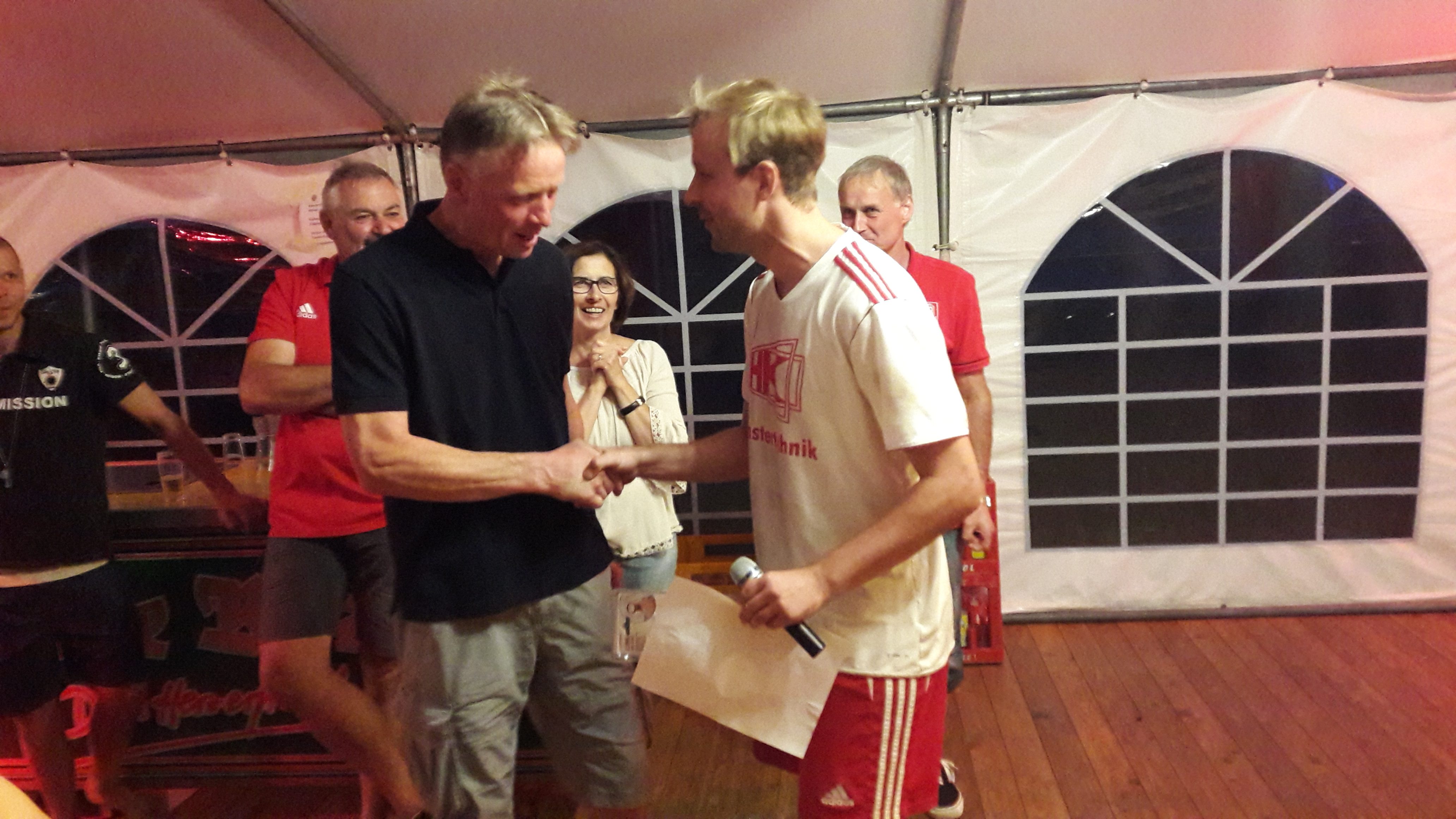 20180818_212645 22. August 2018 • 4128 × 2322 • Rückblick auf den 2. Teil des Sportfestes Basti Heinz beider Siegerehrung. Auch Rolf Mußmann von unseren befreundeten Altligisten des SC „Viktoria“ Lavelsloh erhielt eine Belohnung.
