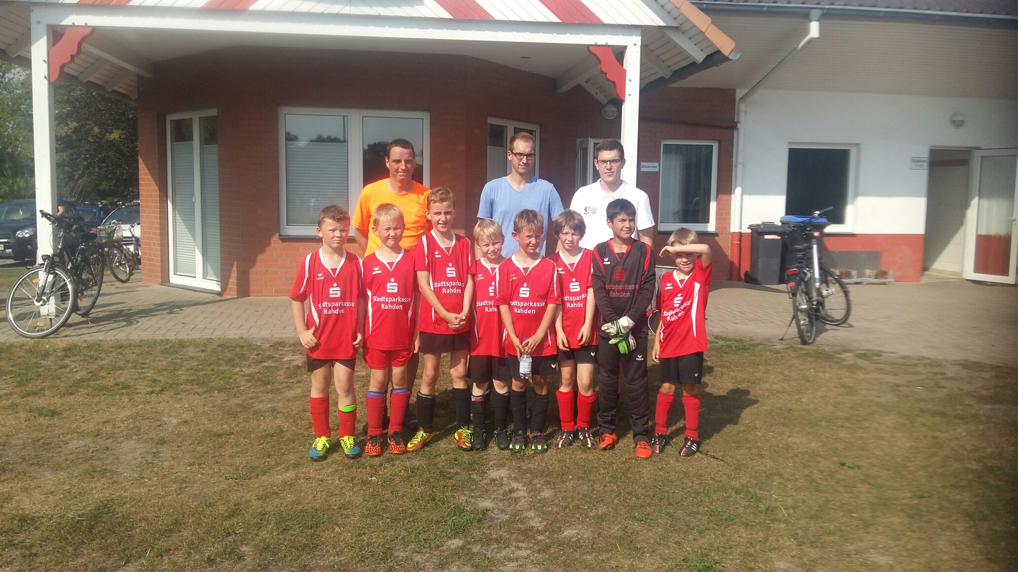 Klaus Drapart, Matze Schlechte und Florian Tegeler haben ihre F-Junioren offenbar gut auf die Saison vorbereitet: im ersten Spiel der neuen Serie gelang im Sportpark ein 8:3 Heimsieg gegen den TuS Dielingen. Das ad hoc geschossene Mannschaftsfoto zeigt die Betreuer hinter einem nicht mehr ganz kompletten Team, weil einige Kinder – vermutlich wegen der für September sehr hohen Temperaturen – mit den Eltern schon den Heimweg angetreten hatten!