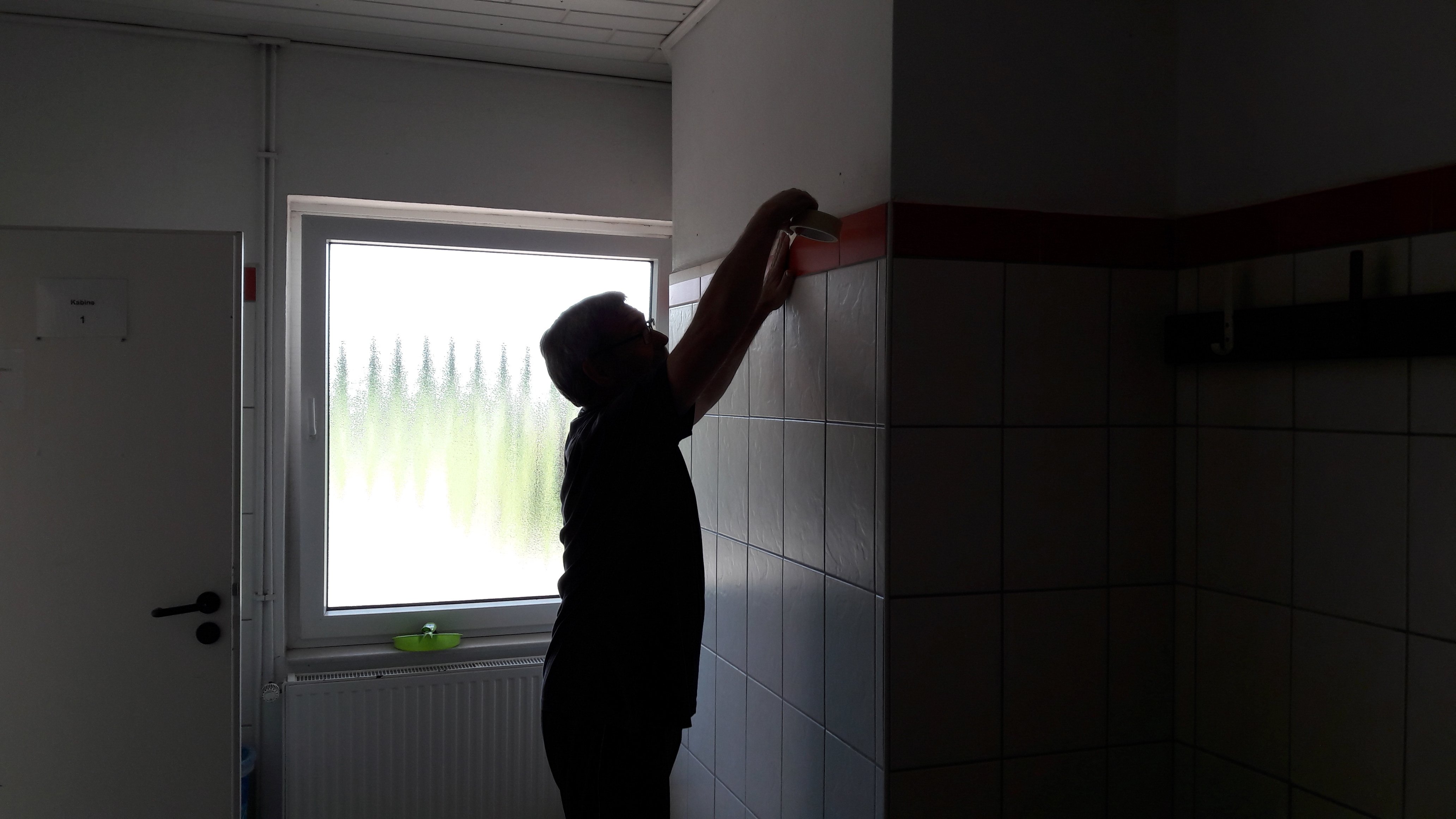 Diese Silhouette zeigt Rudolf Stickan, den „Meister des Abklebens“. Rudolf brachte auch die Befestigungsleiste zum vernünftigen Aufhängen der Besen, Schüppen und sonstigen Geräte im kleinen Putzraum an.