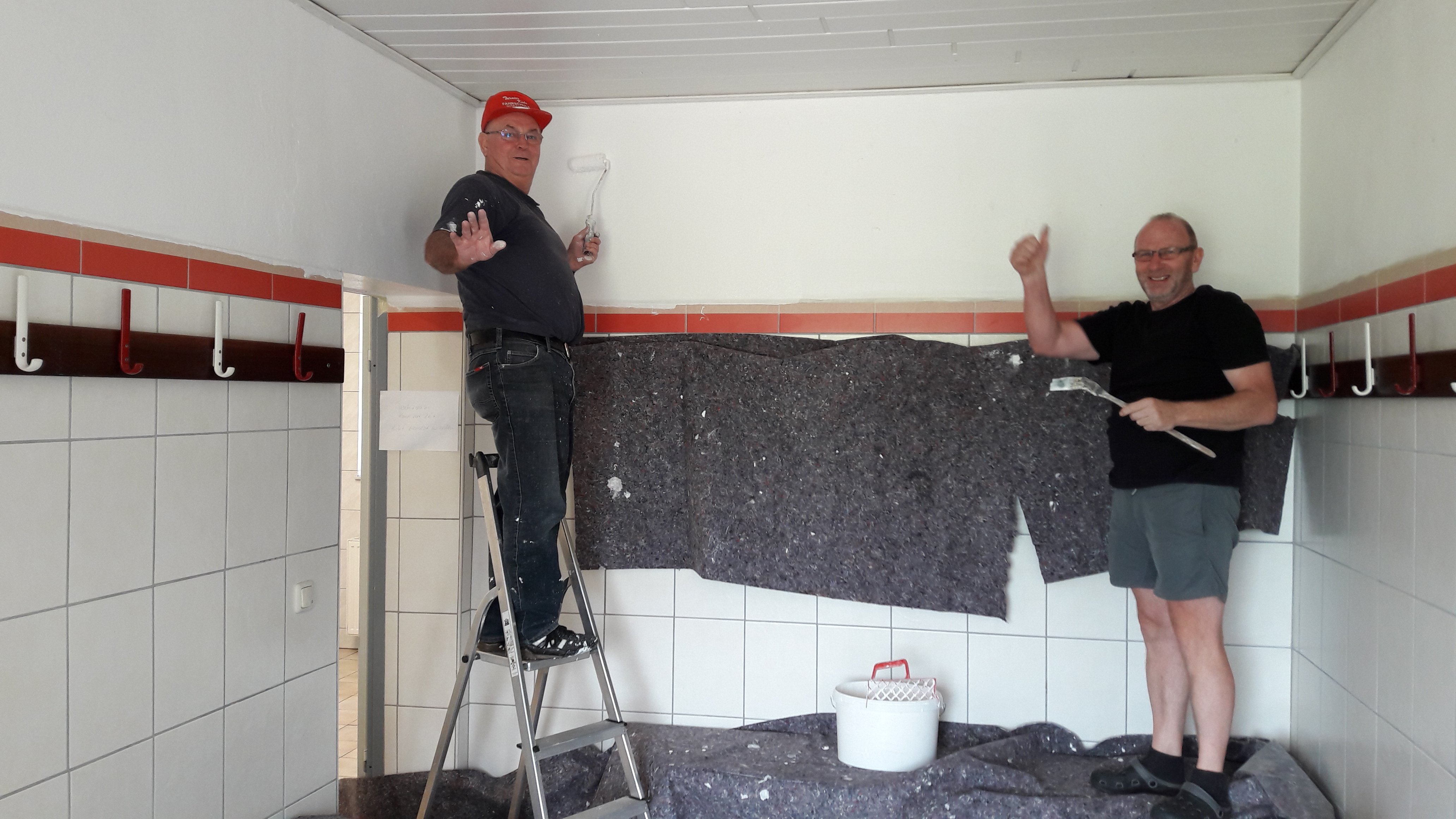 Als eine der ersten Maßnahmen wurden vor  Beginn des 2. Sportfestteils die Duschkabinen und teilweise die Umkleideräume gestrichen. Das erledigten Herbert Henke (rechts), Rudolf Stickan und Kalle Strunk (links).