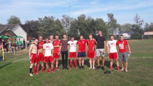 Nach Schluss des Spiels der „Ersten“ folgte noch eine kleine feierliche Zeremonie: Fußballfachwart Wolfgang Wischmeyer hatte für „Patti“ Rossel und Finn Thie, die sich nach der letzten Saison leider aus Tonnenheide in Richtung Blau-Weiß Vehlage bzw. TuRa Espelkamp verabschiedet hatten, noch einen Umschlag als Abschiedsgeschenk mitgebracht und übergab ihn an die beiden Sportkameraden. Wolfgang sagte, dass beide immer wieder offene Türen bei der Eintracht finden würden, falls es in den neuen Vereinen nicht klappen sollte (momentan sieht es allerdings nicht so aus….).