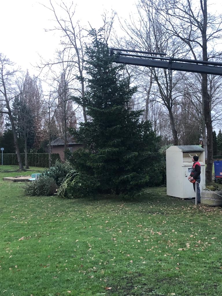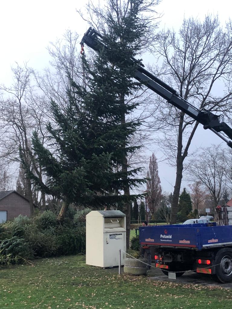 Der ausgediente Dorf-Weihnachtsbaum wird per Kran durch die Firma Petzold angeliefert.
