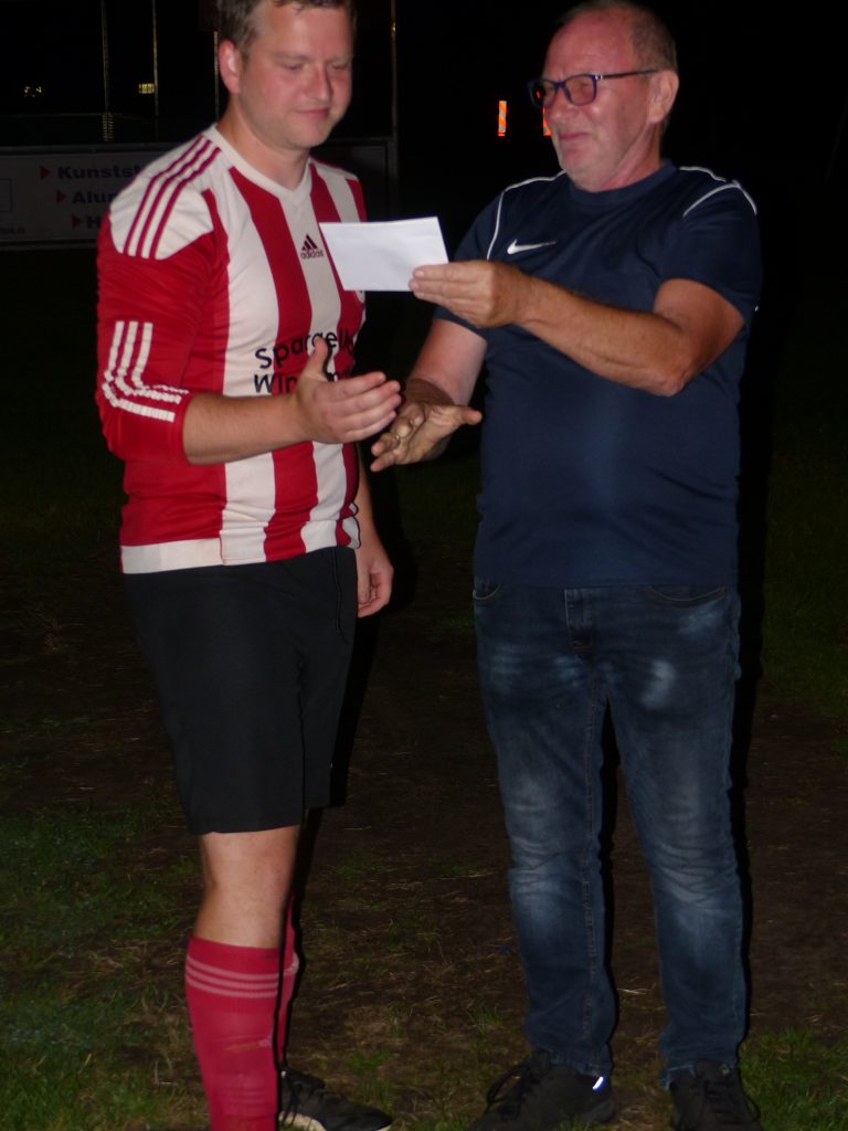 Herbert Henke übergab im Namen des Stadtsportverbandes Rahden die Preise: links Sanasar Harutjunjan von TuSpo, in der Mitte an den Varler Spielführer und rechts den Siegerscheck an Kapitän Nils Schlottmann von der Eintracht.