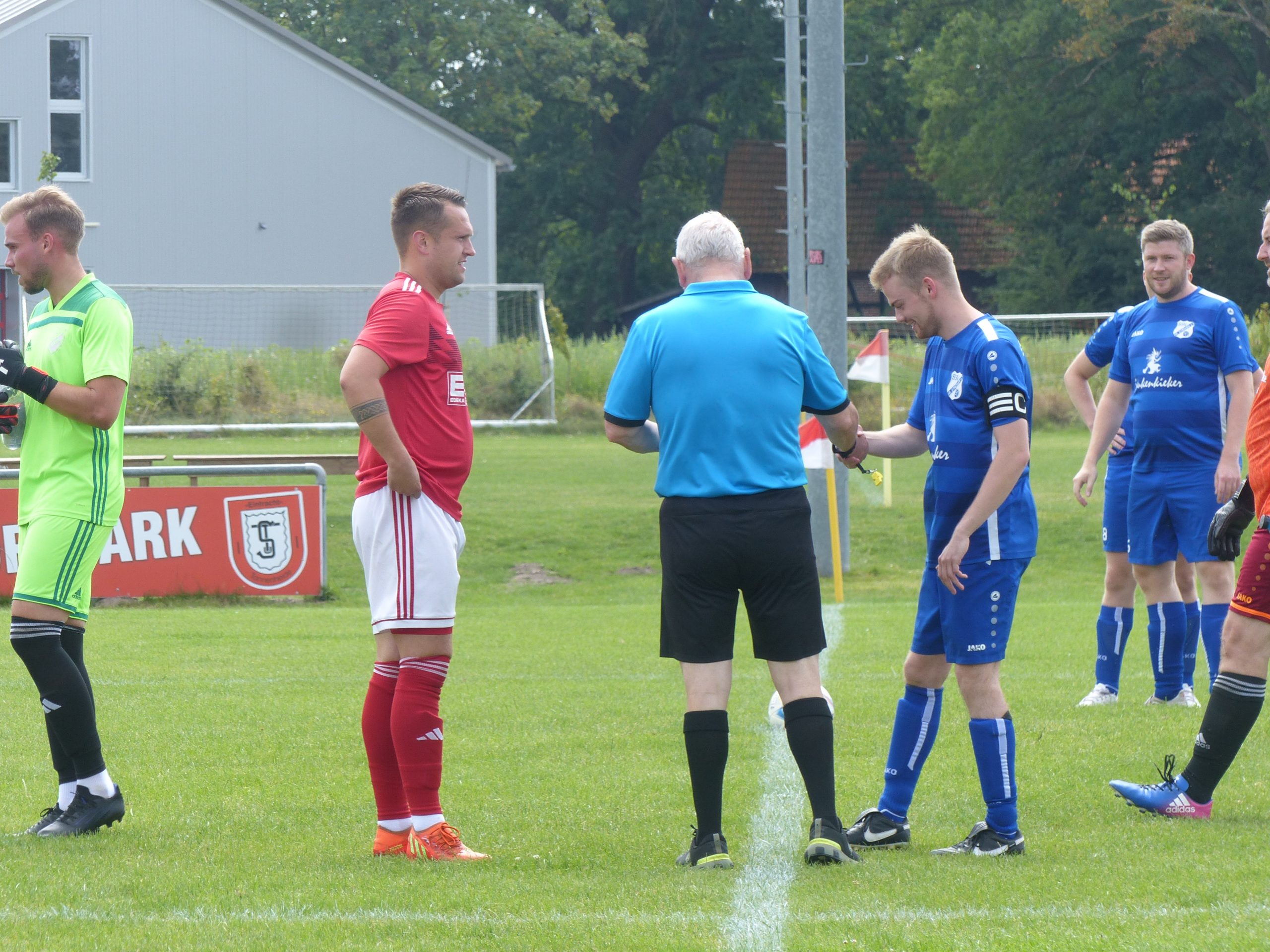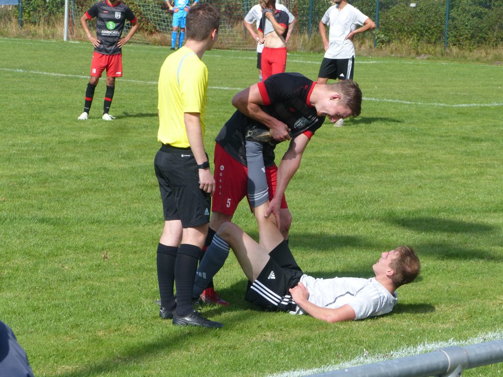 Oben links: Kapitän Rico Wischmeyer bei der Begrüßung, in der Mitte Gefahr vor dem TuSpo-Tor. Trotz aller Hitzigkeit im Spiel ging man doch letzten Endes ziemlich fair miteinander um: hier im Bild rechts hilft der Gegner bei einem Krampf von Tim Möhlenpage. Unten links beide Teams nach Abpfiff des Spiels, daneben Keeper Yannik Thie, der hier die falsche Ecke wählte und rechts Oli Kahl.
