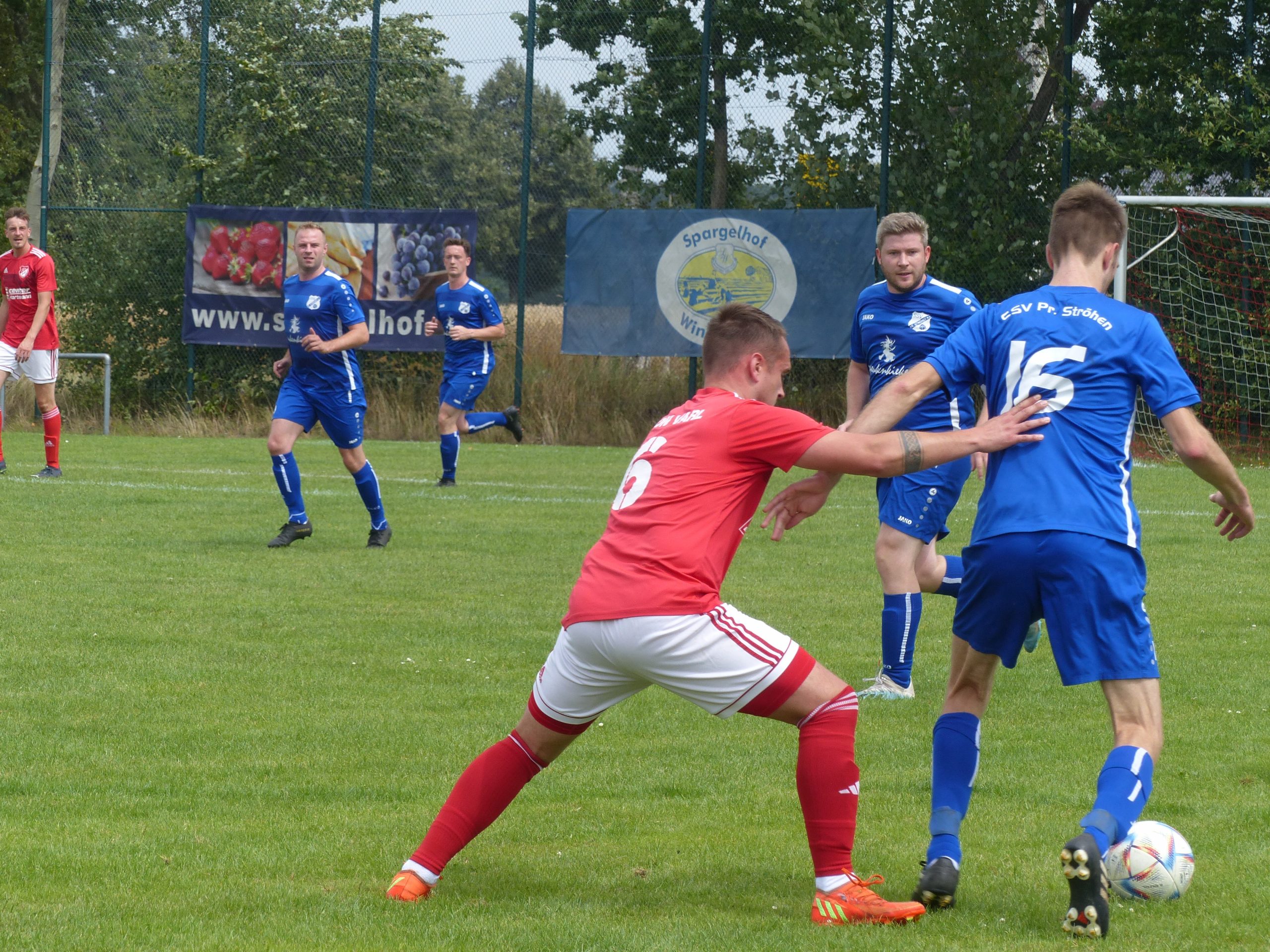 Rechtes Bild: David Rawling pfiff die Partie Varl gegen Pr. Ströhen. Links setzt sich Luke Jackson vehement gegen einen Ströher Spieler ein.