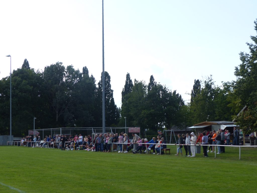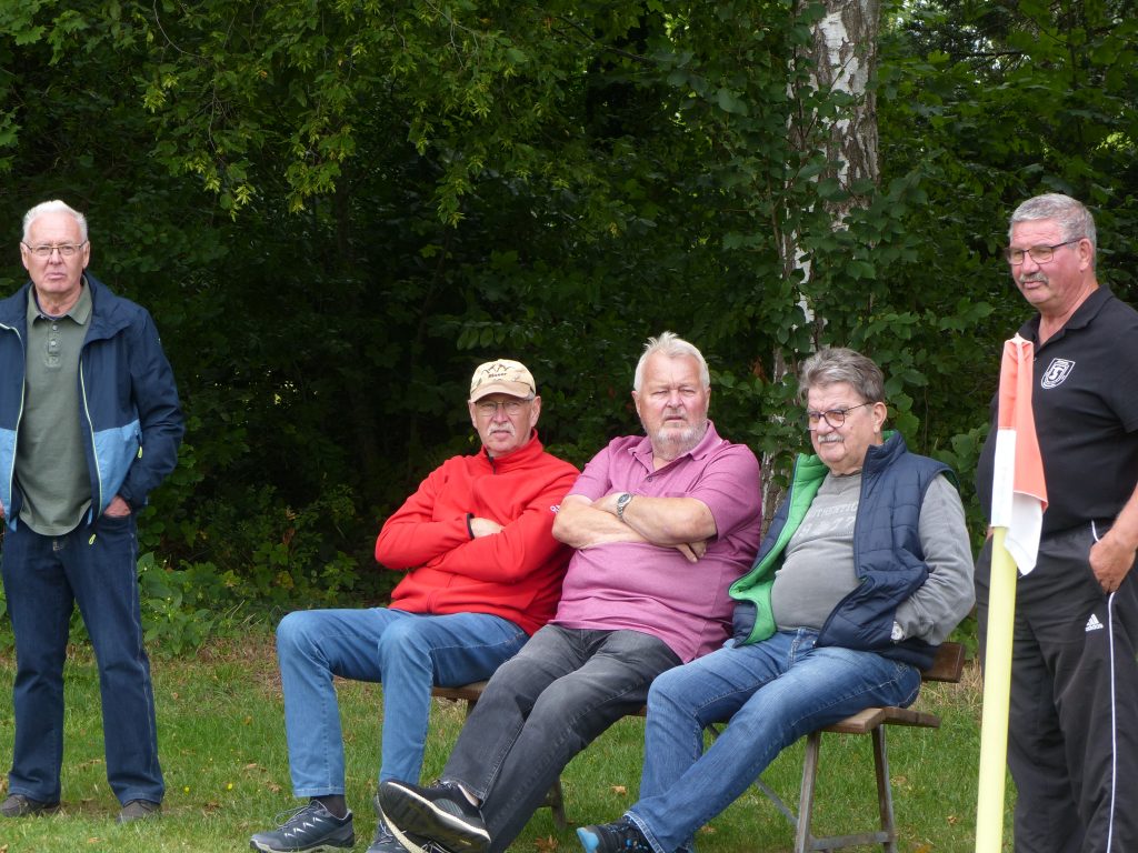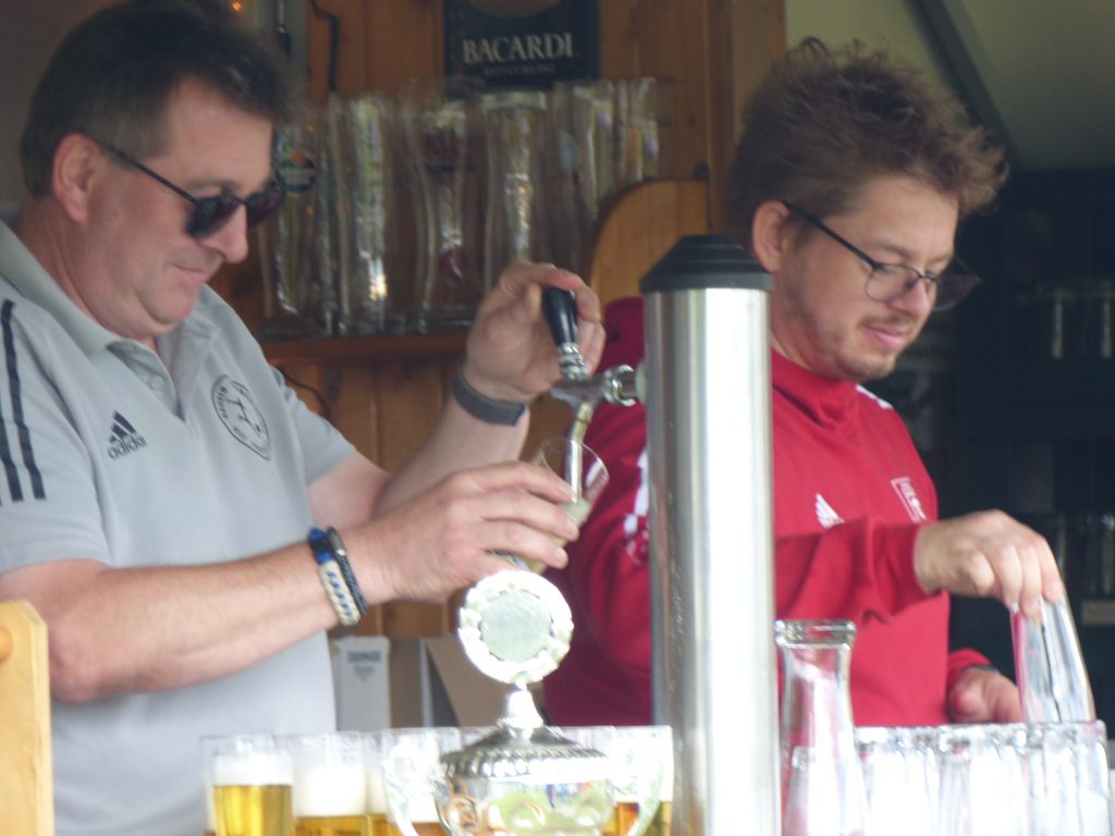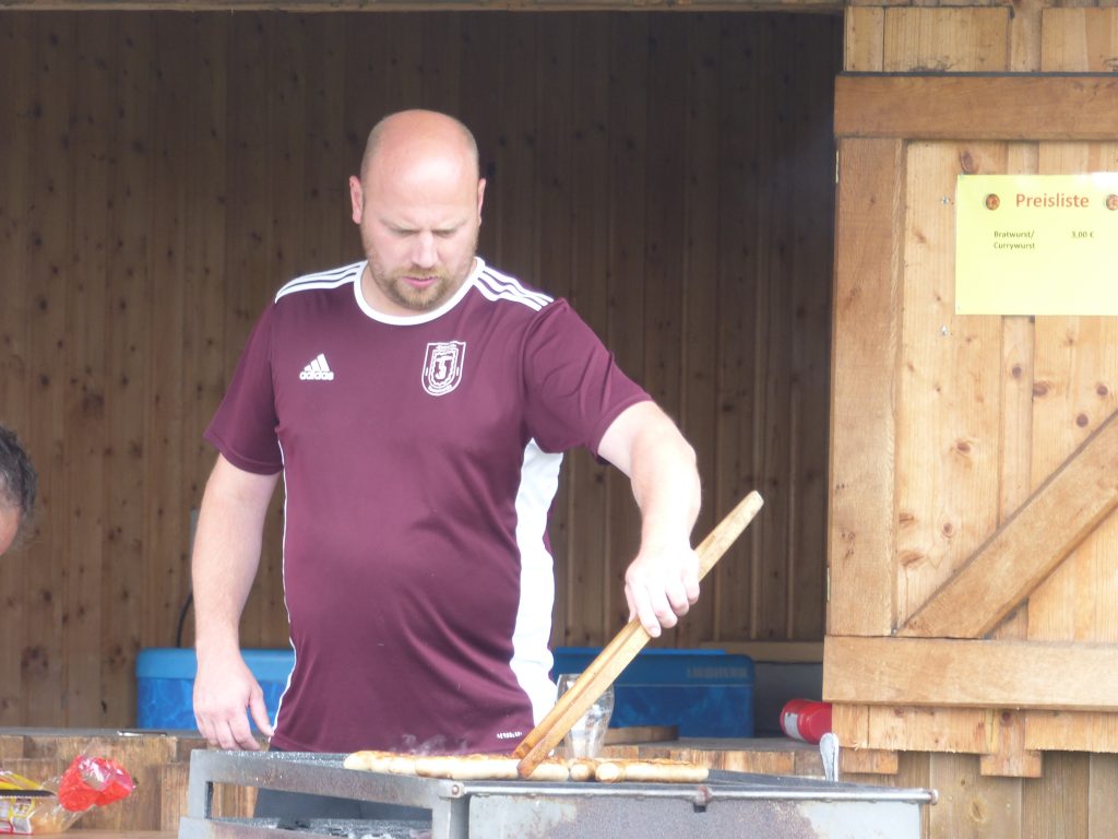 Maik nahm nicht nur die Siegerehrung vor, sondern kümmerte sich zusammen mit Wolfgang Wischmeyer auch um die Versorgung mit Bratwürstchen. Die Getränkeversorgung lag in den Händen von Andreas „Taube“ Mayer. Alle drei also vom geschäftsführenden Vorstand im Einsatz. Zudem half Sascha Bergsieker als einziger (schade) aus dem Kader der III. Mannschaft am Getränkewagen. Eine ansehnliche Zuschauerzahl war am Sonntag dabei, wie auf dem linken unteren Bild zu sehen ist. Und auf dem rechten oberen Bild die Eintracht-Honoratioren.