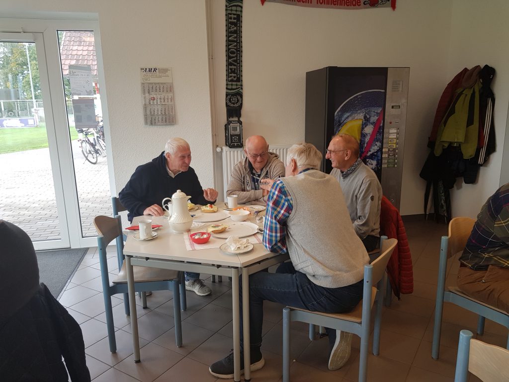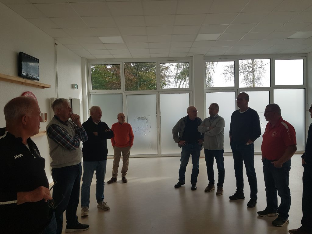 Krankheitsbedingt bzw. aus anderen Gründen konnten fünf Sportkameraden nicht am traditionellen Frühstück teilnehmen. So waren 15 Leute dabei. Nach dem Imbiß, der von der heimischen Bäckerei Kölling schmackhaft vorbereitet worden war, führte Hausmeister und ebenfalls langjähriger Stürmer der Eintracht, Hans Werner Tegeler, durch das renovierte Gebäude und den Sportpark. Danach kam man im Jugendraum zu einem interessanten Vortrag, den Gerhard Hartmann in bewährter Weise vorbereitet hatte, erneut zusammen. Die Zeit verging wie im Flug, weil etliche Geschichten und Anekdoten aus der Zeit von vor 50 Jahren ganz kurzweilig waren.