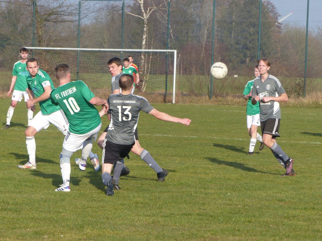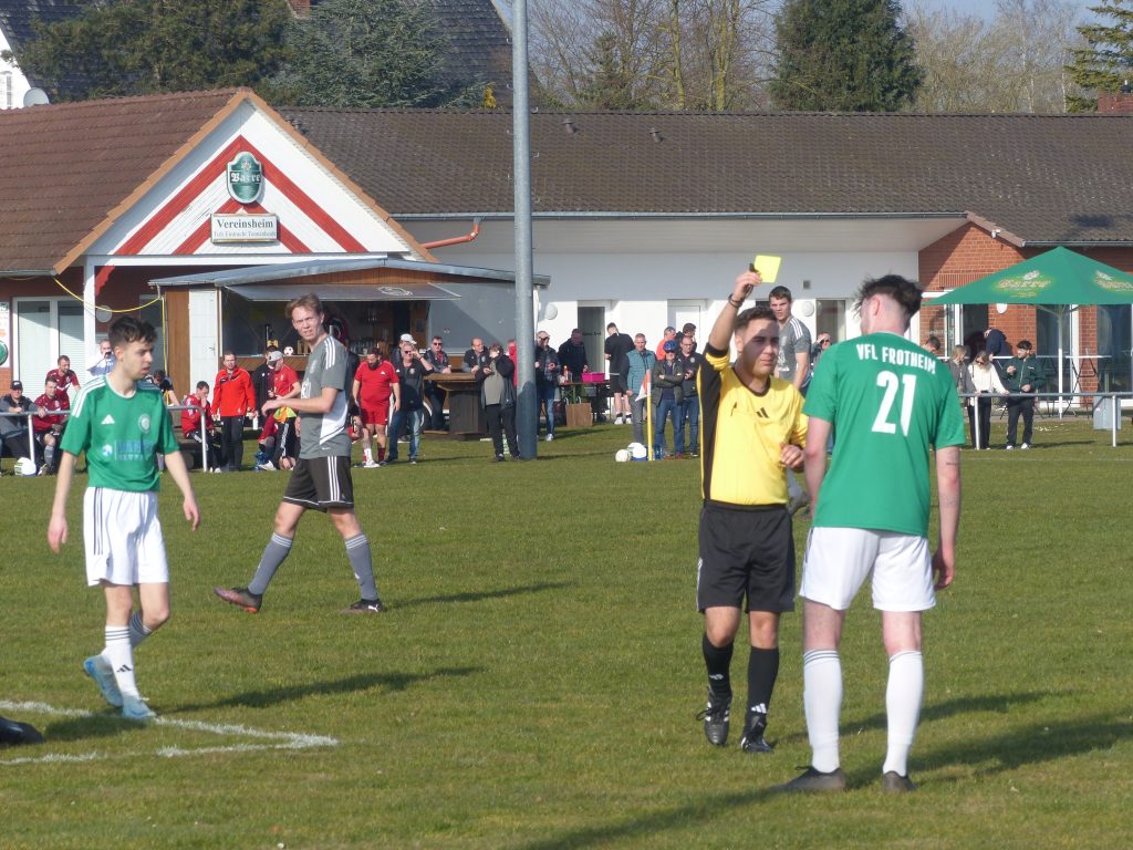 Der Sieg hätte sogar noch höher ausfallen können, denn ein Lattentreffer und ein Ball, der nach Augenzeugenaussagen klar hinter der Torlinie des Frotheimer Kastens war, waren noch zu verzeichnen. Nach 16 Minuten die Eintracht-Führung durch einen von Kapitän Moritz Wiegmann verwandelten Elfmeter. Sieben Minuten später bereits das 2:0 durch ein „Traumtor“ von Lukas Koob. Wiederum zwei Zeigerumdrehungen später kamen die Frotheimer, die insgesamt harmlos wirkten, zum Anschluss. Doch ein Standard von Kevin Mayer in der 40. Minute sowie ein Treffer von Björn Lüker in der letzten Minute der ersten Hälfte stellten das Ergebnis auf 4:1. Pause.