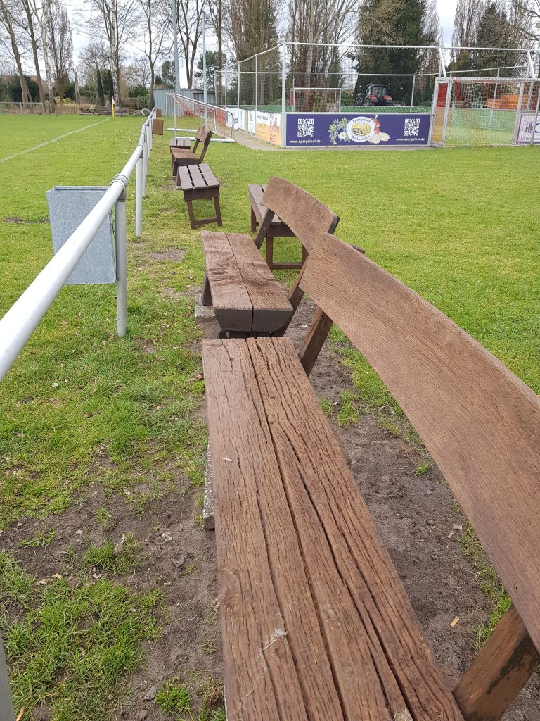 Die bestanden u.a. aus dem Schneiden der Äste und Zweige, die sich im Fangzaun zum Kirchweg hin „durchgebohrt“ hatten, dem Neu-Anbringen bzw. Versetzen von Werbebanden, Freiflächen hinter den Torlinien schaffen um noch mehr Werbebanden anzubringen, Rasenkanten unter den Werbebanden entfernen, Aufnehmen von Pflastersteinen und Neuverlegen am hinteren Eingang zum Vereinsheim, Zusammenbau von neuen Mini-Toren für die Junioren, Flicken der Netze der Fangzäune und aus erneutem Aufbau der neuen Barre-Sonnenschirme, weil die Höhe nicht ganz gestimmt hatte. Dazu wurden im Vorfeld alle Holz-Sitzbänke sowie der „runde Stammtisch“, den Matze Möller erneuert hatte, mit Lasur gestrichen.