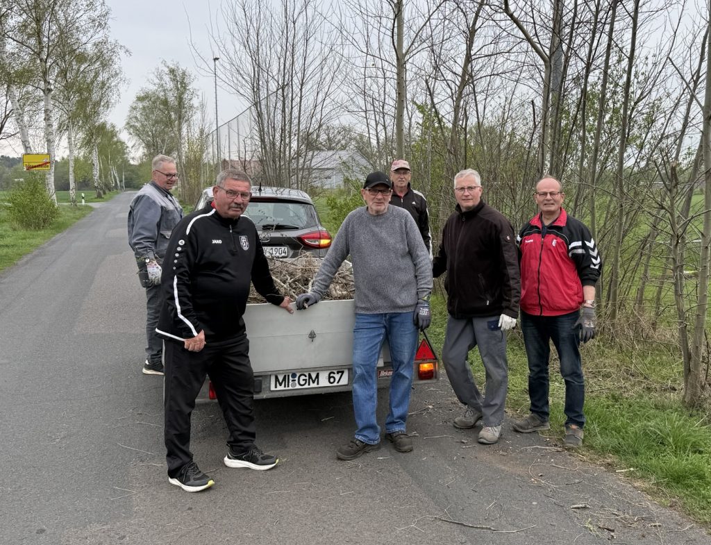 Nachdem der Fangzaun hinter dem Tor von Sportplatz 1 vom Getrüpp befreit worden war, wurde dies in einer gesonderten Aktion verladen und ordnungsgemäß entsorgt. Dabei war mit Carsten Ruhnke auch ein „Neuling“ beim Sportplatzteam. „Wenn ich Zeit habe, unterstütze ich die Truppe gerne“, so der 55-jährige Rahdener. Karsten ist bei Spielen unserer Ersten meist als Zuschauer dabei und fährt auch bei der gemütlichen Fahrradgruppe mit. Auf dem rechten Foto: von links Friedhelm Bergsieker, Werner Tegeler, Herbert Henke, Reinhard Bohnhorst, Neuzugang Carsten und Günter Helmich.