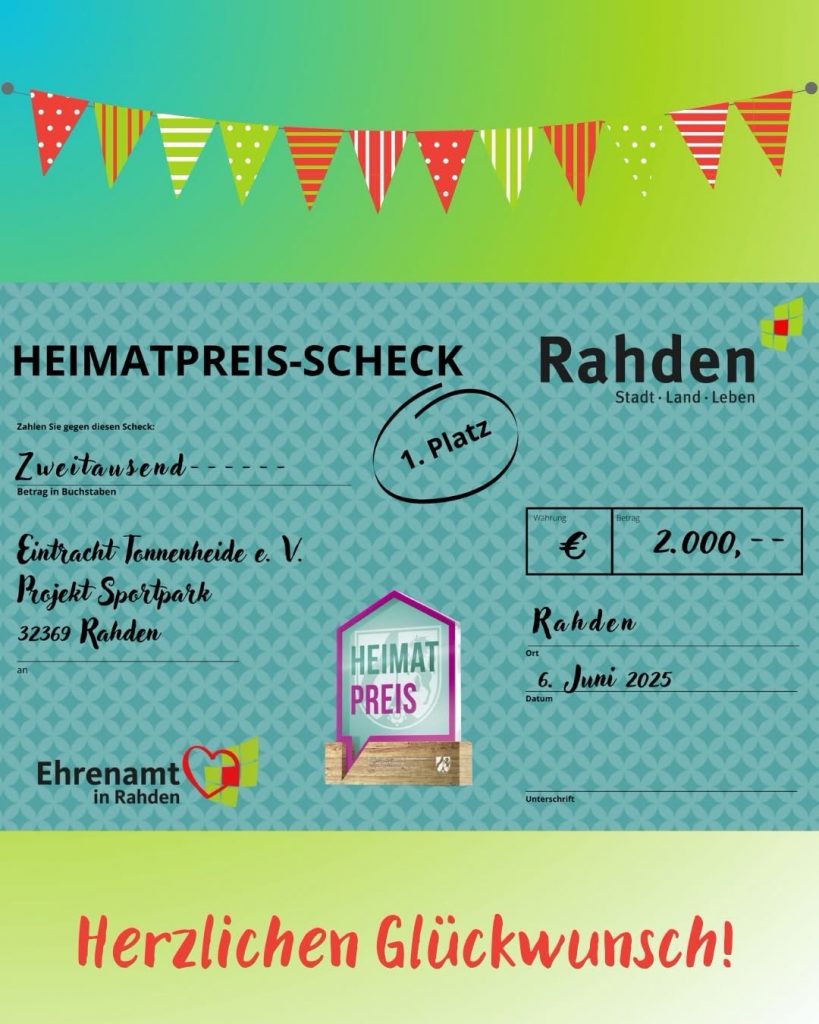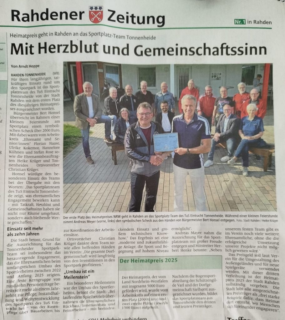 … und zur Verwunderung aller waren nicht nur der Bürgermeister, sondern auch andere hochrangige Kommunalpolitiker am Sportpark! Die Vertreter der Stadt hatten eine tolle Überraschung für das Sportplatzteam parat: es gab den Heimatpreis der Stadt Rahden, dotiert mit 2000 €, für die Eintracht und ihr Team. Hier der Scheck und die Veröffentlichung in der Rahdener Zeitung: