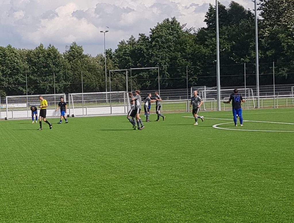 Links oben: unser Vorsitzender Maik konnte es auch nicht rausreißen. Er wurde für Fiete Wiegmann eingewechselt. Rechts: zwei Ecken brachten kurz vor Schluss leider auch nichts mehr ein, hier ist eine zu sehen. Unten: über den Ausgleich durch Niki Peper freut sich die Mannschaft.