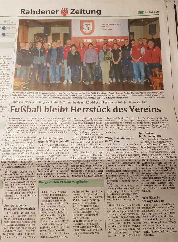 Presseveröffentlichung über die JHV. Und noch einmal ein Überblick über die Termine der Jubiläums-Veranstaltungen 2026. 1. Februar 2026 in Allgemein Die Rahdener Zeitung berichtete über die Jahreshauptversammlung der Eintracht: