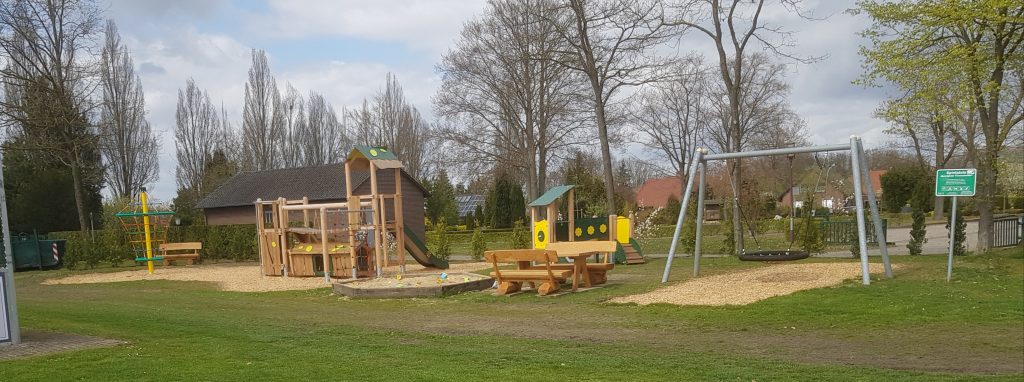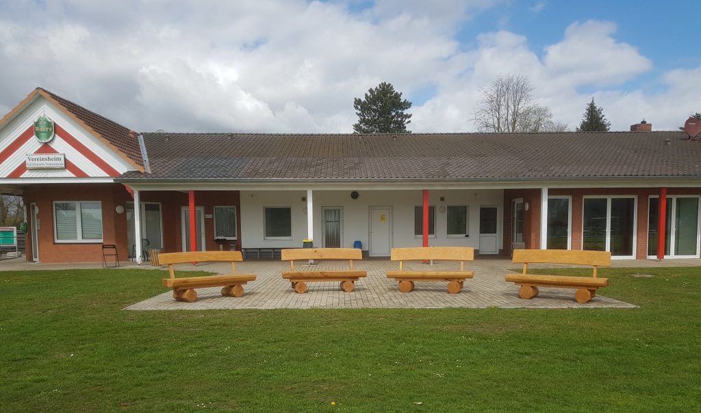 Links der neue Spielplatz. Damit die Kinder, die sich dort verweilen, auch von Eltern oder Großeltern im Auge behalten werden können, gibts für die auch bequeme Sitzmöglichkeiten. Und die Bänke vor dem Vereinsheim erlauben einen ungehinderten Blick der Zuschauer auf das Spielfeld.